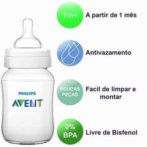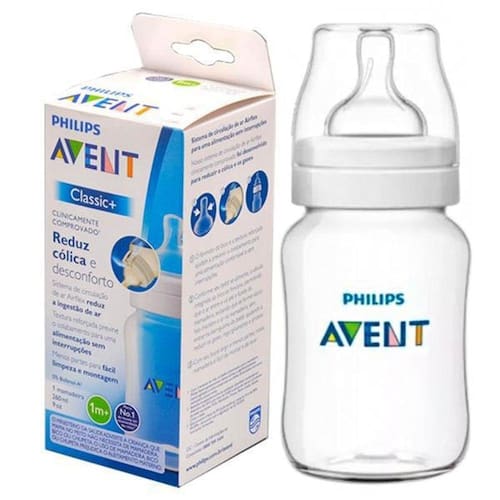 Mamadeira Anti-Colic Classica Transparente 260Ml 1M+ Mamadeira clássica 260ml (bico 2) anti-cólica - philips avent +1m. A mamadeira avent classic da philips possui bico exclusivo que promove uma alimentação saudável e ativa que funciona de acordo com o ritmo natural de mamar do seu bebê. O bebê alterna mais facilmente entre a mamadeira e o peito. Além disso minimiza significativamente o incômodo, principalmente à noite. Na medida em que o bebê mama, o exclusivo diafragma do bico avent é flexionado, permitindo a entrada de ar na mamadeira e não na barriga do bebê. Produto garantido contra defeito de fabricação. Produto Isento de Registro, conforme Resolução Nº10, de 21/10/1999, da ANVISA. Produto de acordo com NBR 13.793.