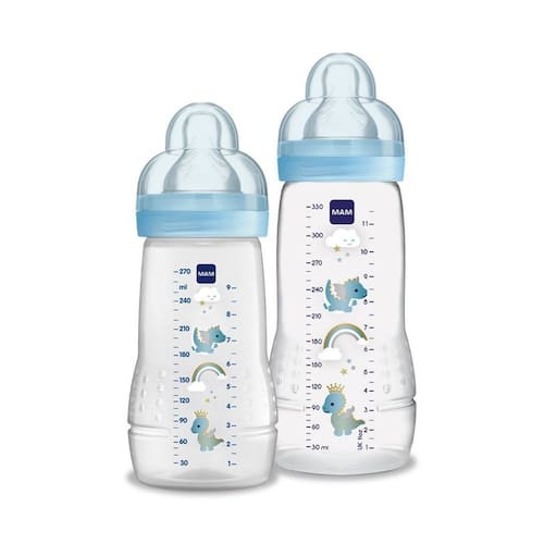 A Mamadeira Easy Active da MAM, foi desenvolvida com ajuda de especialistas da saúde, o set contém 1 mamadeira de 270ml recomendada a partir de 2 meses e 1 mamadeira de 330ml recomendada a partir de 4 meses em fase mais ativa e possui estampas modernas e divertidas.