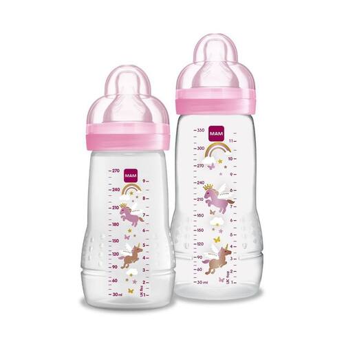 - Embalagem dupla: contém 1 mamadeira de 270ml e 1 mamadeira de 330ml