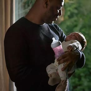 A Mamadeira com o novo bico antivazamento Pétala apenas liberta leite quando o bebé bebe ativamente.