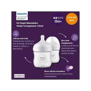 O bico com formato largo é feito de silicone e o copo em polipropileno, fácil de limpar, com uma montagem rápida e prática, combina amamentação natural com a mamadeira. As pétalas no bico aumentam a flexibilidade e promovem a pega correta, para que o bebê possa abocanhá-lo como se fosse o seio, facilitando a o ritmo da amamentação.