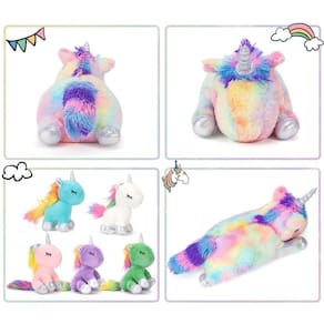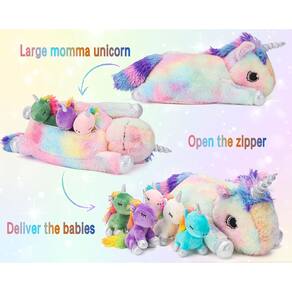 Decorações de festa de unicórnios fofos de pelúcia: o design exclusivo e engenhoso inclui chifres e cascos dourados brilhantes, o corpo da mamãe é branco, 4 pelúcias para bebês são rosa, azul, roxo e branco, olhos brilhantes, cada membro da família todos têm crinas e caudas iridescentes. Sua princesinha vai adorá-los porque eles são muito adoráveis. Adequado para muitas ocasiões, aviões, carros, restaurantes, etc. decorações de festa de Natal, decorações de festa de aniversário - Brinquedos adoráveis de unicórnio e bebês: 5 lindos unicórnios de pelúcia na barriga da mamãe, abra o zíper para ver isso, que surpresa! As meninas adoram este presente de unicórnios - Brinquedos de pelúcia de unicórnio: conjunto de brinquedos de pelúcia de unicórnio seis em um, estimula a imaginação enquanto ela brinca de veterinária, mamãe unicórnio e bebês, até mesmo nomeando os bebês - Brinquedos de pelúcia de unicórnio para meninas: os unicórnios de pelúcia são feitos do material de algodão PP mais confortável e macio e são ótimas decorações de festa de unicórnio para camas e cadeiras (etc.) - Presente de unicórnio perfeito: ideal para festas temáticas de unicórnio, aniversário, Natal, dia das bruxas, ação de graças, ano novo. Adequado para crianças de 2, 3, 4, 5, 6, 7, 8, 9 anos ou mais - Tamanho perfeito dos brinquedos de unicórnio: o unicórnio da mamãe tem cerca de 45 cm, os unicórnios para bebês têm cerca de: 15 cm, portáteis para carregar e leves, os tornam companheiros ideais para todas as viagens