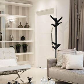 Por ser um cabideiro chão é uma peça flexível, ótima para servir como arara de roupas, mas também pode ser utilizada como cabideiro bolsa, para melhor acomodar os seus pertences pessoais.