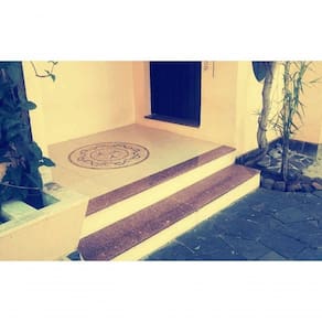 Pedras utilizadas: Granito Vermelho Brasília, Mármore Branco espirito santo, Tons de Verde e Travertino Bege. Os tons podem variar conforme o lote das pedras