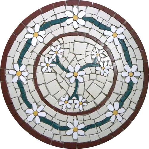 O Rosone Floral é um clássico de origem no Mosaico Romano. Há mais de 10 anos, ele tem sido um dos modelos mais pedidos em nosso ateliê, devido à sua estilização elegante da margarida, composta por 6 tesselas de pedra branca.