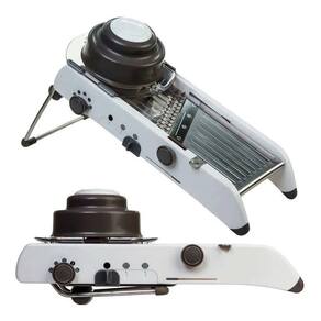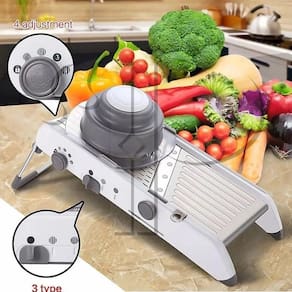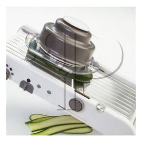 Conteúdo da embalagem - 1 Mandoline + 1 Suporte fixador de alimento 18 Opções de Corte: 8 tipos de Juliennes, 4 tipos de fatias, 4 tipos de Waffles e 2 tipos de Trituração. Bandeja: 11 cm de Largura x 30 cm de comprimento, área útil. Dimensões do produto montado: 38cm ( comprimento) X 16cm (largura) X 20cm (altura) Lamina em Aço Inoxidável de 12 cm angulada em 30 graus para melhor corte dos alimentos