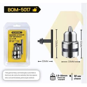 O Mandril com Chave 1/2 20F. Fosca Bom-5017 é a ferramenta ideal para quem busca precisão e eficiência em perfurações. Com um design ergonômico, proporciona conforto durante o uso, permitindo um ajuste e aperto seguros. Suas três garras fixas garantem uma perfuração estável, essencial para trabalhos que exigem alta qualidade. Este mandril é compatível com chaves de mandril que variam de 1.5 a 13 mm, oferecendo versatilidade para diferentes tamanhos de brocas. A chave de 10 mm facilita o manuseio e a troca de ferramentas, tornando-o um item indispensável para profissionais e entusiastas