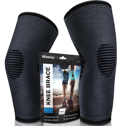 POWERLIX Manga de compressão de joelho (par) – Melhor joelheira para dor no joelho para homens e mulheres – suporte de joelho para corrida, basquete, vôlei, halterofilismo, academia, treino, esportes