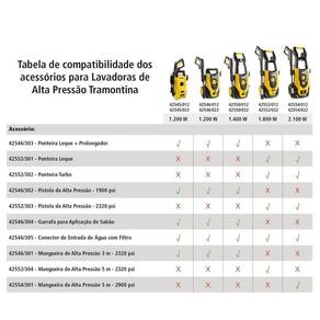 Comprimento: 5 m Pressão máxima: 16 MPa; 160 bar; 2320 psi Temperatura máxima de operação: 60C Adaptável as lavadoras de alta pressão Tramontina: 42552/012 42552/022