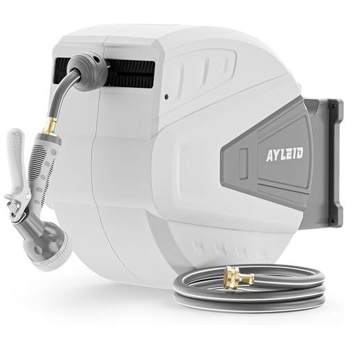 Mangueira de Jadim 30M com Enrolador Retrátil, Bico Pulverizador 9 Funções e Sistema de Retorno Lento, Ayleid, Cinza e Branco