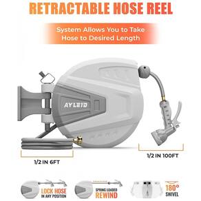 Bloqueio livre Quando você puxa a mangueira no comprimento necessário, ela trava automaticamente a posição para impedir que a mangueira se retraia e não há comprimento extra para causar dobras e emaranhados, por isso é mais conveniente usar água. Rebobinamento automático Após o uso, basta puxar suavemente a mangueira para fora para ativar o mecanismo de recuperação automática, a mangueira será recuperada automaticamente lentamente e organizada automaticamente no interior, para garantir a arrumação. Suporte giratório Equipado com um suporte giratório, que pode ser fixado na parede sólida para atingir rotação de 180, atendendo à sua rega multidirecional. Bocal de 9 padrões Bocal de 9 padrões disponível para ter diferentes formas de pulverização que incluem chuveiro, centro, plano, imersão, névoa, jato, triângulo, enxágue e cone, atendendo às diversas necessidades de irrigação dos clientes. Pacote incluído Carretel Ayleid de 1 unidade com mangueira de 30M Bocal de mangueira de 1 unidade Bocal de spray de 9 funções de 1 unidade 1 unidade de montagem em parede 4 parafusos Manual do usuário de 1 unidade.