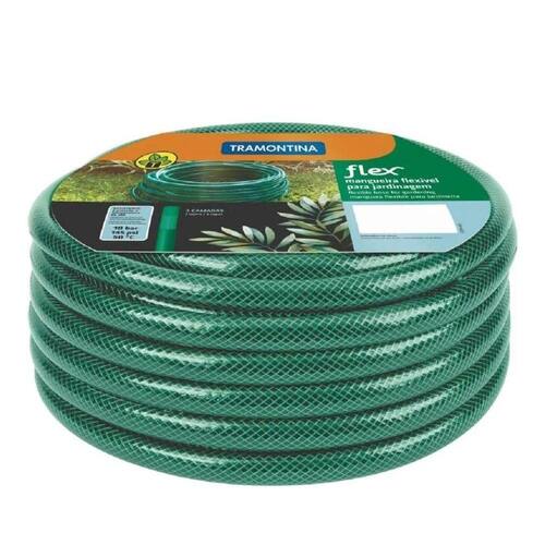 Os momentos no jardim vão ficar ainda mais prazeroso com a mangueira flex Tramontina verde em PVC 3 camadas 25 m com engate rosqueado e esguicho. Resistente e eficiente, ela auxilia na hora de irrigar os lugares mais difíceis. Acompanha um esguicho com jato regulável e um adaptador com engate rosqueado. Produzida em PVC, material que garantem flexibilidade. Ela possui 25 metros, perfeita para as exigências que você encontrar no cuidado da sua casa. Informações Gerais