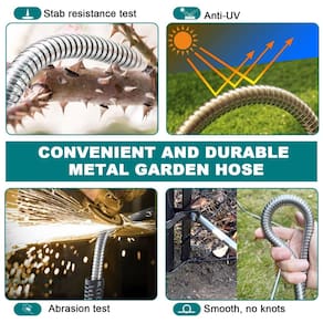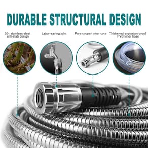 A mangueira de jardim de aço inoxidável Relxitl possui um exterior de aço inoxidável 304 e tubo interno de PVC espesso, tornando-a resistente à corrosão e durável para uso prolongado. Seu design leve e flexível evita embaraço, permitindo que ele passe facilmente por obstáculos. O conector de alumínio atualizado é resistente e à prova de vazamentos, e o bocal oferece 10 padrões de pulverização para atender às necessidades de irrigação e limpeza. Fácil de armazenar após o uso, economizando esforço e espaço. - Material de alta qualidade: a mangueira de jardim Relxitl é feita de aço inoxidável 304 de grau comercial com um tubo interno de PVC espesso, é mais resistente do que as mangueiras de água padrão, resistente à corrosão, à prova de ferrugem e construída para uso duradouro. - Leve e sem emaranhados: esta mangueira de jardim leve e flexível é fácil de manobrar, permitindo que ela passe suavemente através de árvores, superfícies pavimentadas e cantos sem dobras ou emaranhados, tornando-a mais fácil de usar. - Conector atualizado: equipado com um conector de alumínio estendido, oferece um ajuste seguro e resistente a vazamentos e maior durabilidade. O aço inoxidável e o design flexível proporcionam uma vida útil mais longa e liberdade para movê-lo em qualquer direção. - Bocal multifuncional: inclui um bocal com 10 padrões de pulverização e uma alça de borracha ergonômica antiderrapante, permitindo fácil controle do fluxo de água, tornando-o uma ferramenta de jardinagem eficiente. - Armazenamento conveniente: esta mangueira de jardim de metal é fácil de enrolar e armazenar e conveniente de transportar. Após o uso, drene a água da mangueira para um próximo uso mais fácil.