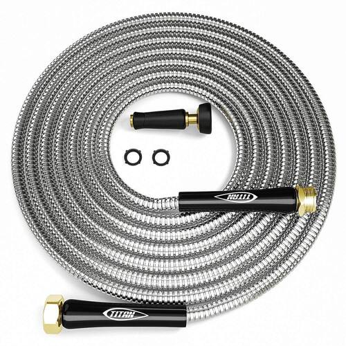 TITAN Mangueira de jardim 2,5 m - Mangueira de água de metal de aço inoxidável 304, flexível, sem dobras, leve, durável, resistente a esmagamento, fácil de enrolar, 500 PSI - ? Aço inoxidável TITAN 304 – Apresentando a mangueira de jardim de metal de aço inoxidável de alto desempenho da Titan. Aço inoxidável 304 de grau comercial que é altamente durável, não enferruja ou corrói e é resistente a vazamentos e superfícies robustas - ? O design funcional o torna ideal para uso diário – É incrivelmente leve para uma mangueira de jardim e é tão flexível que você poderá usá-la sem esforço todos os dias. Seu design durável e eficiente o torna capaz de suportar o uso diário. - ? Esqueça todos os problemas comuns da mangueira – Chega de dobrar, embaraçar, perfurar, estourar ou torcer! Nossa mangueira de jardim de metal premium foi projetada para nunca embaraçar, garantindo melhor desempenho e vida útil. - ? Acessórios resistentes farão o truque – Nossa mangueira de jardim de metal tem acoplamentos resistentes que são muito fáceis de fixar e destacar. Eles são à prova de esmagamento e resistentes a vazamentos, incluímos até arruelas extras para que nenhuma gota de água seja perdida - ? A DIFERENÇA TITAN – Estamos muito confiantes na versatilidade e durabilidade de nossa mangueira de água de jardim de metal premium. É por isso que oferecemos uma garantia de devolução do dinheiro em 30 dias e uma substituição de 12 meses líder do setor para todos e quaisquer defeitos de fabricação. Se você tiver algum problema com seu produto, basta entrar em contato pesquisando nosso nome (Titan_Products) no lado direito da página. Inclua o número do seu pedido e poderemos ajudar com reivindicações de garantia.