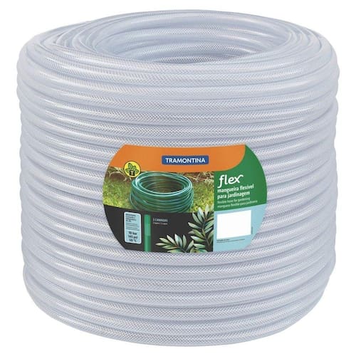 Mangueira Flex Tramontina Transparente Em Pvc 3 Camadas 100 M Tramontina Mangueira Flex Tramontina Transparente em PVC 3 Camadas 100 m Tramontina - Que tal ter uma mangueira que deixará a atividade de irrigar as plantas ou lavar a garagem mais prazerosa? Com a Mangueira Flex Tramontina Transparente em PVC 3 Camadas 100 m, você vai se divertir enquanto realiza as tarefas de casa. Por ser leve e mais fácil de manusear, a peça produzida em PVC conseguirá atingir os lugares mais difíceis do seu quintal. Além disso, é revestida por três camadas e uma delas é em poliéster oferecendo mais resistência a torção e diminuindo as chances de danificar o produto. Com a Tramontina seus produtos terão mais resistência e qualidade.- Mangueira flexível e de fácil manuseio. - Possui 200 metros de comprimento. - Recomendada para situações de uso com pressão da água de até 10 bar [145 psi] e temperatura de 50 C. - Para maior resistência possui 3 camadas distintas: interna em PVC, intermediária em fio de poliéster trançado e externa em PVC.Observações- A mangueira é recomendada para uso doméstico ou profissional na jardinagem, em situações com pressão da água de até 10 bar [145 psi]. - Para aumentar a durabilidade da mangueira, não deixá-la exposta ao sol após o uso. - A temperatura máxima de trabalho da água deve ser 50 C. - As metragens a partir de 50 metros destinam-se à venda de metro em metro, sendo recomendado o uso de expositores para esse fim. - Para descarte dos produtos e embalagens siga as orientações de reciclagem vigentes.Características GeraisEAN137891117054702DUN1417891117054709NCM3917.39.00Peso Líquido21,6840 kg.Peso Bruto21,7510 kg.Metragem0,054150 m.Dimensões Embalagem (Compr. X Larg. X Alt.)475x 475x 370 mm.Dimensões Produto (Compr. X Larg. X Alt.)275x 275x 370 mm.Cor 1F8F8F8 Hexa Características Gerais do Produto: Garantia: - 1 Ano