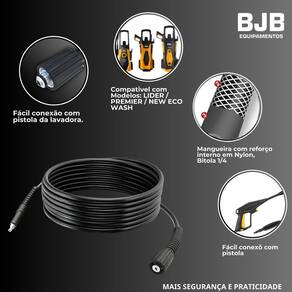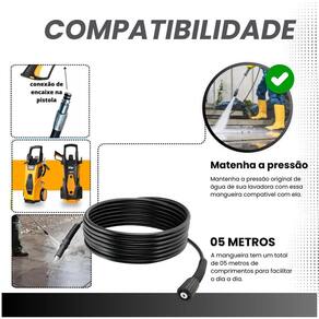 Tamanho: 5 metros, proporcionando maior alcance e praticidade na limpeza. Bitola: 1/4 polegada, garantindo resistência e eficiência no fluxo de água. Terminal Máquina: M22 rosqueável na lavadora. Terminal do Gatilho: Engate rápido para fácil conexão.