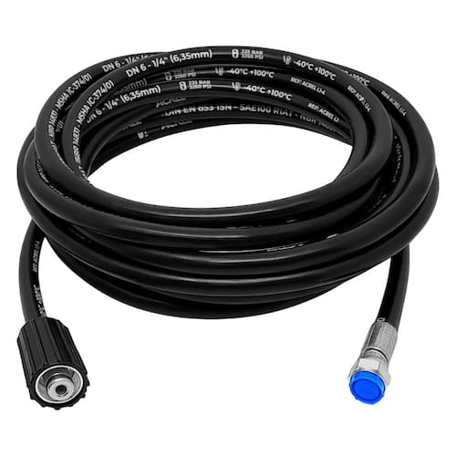 Mangueira de Alta Pressão para Lavadoras, com trama interna em aço, recoberta com borracha sintética, altamente resistente e flexível com conectores resistentes a oxidação. Pronta para uso.
