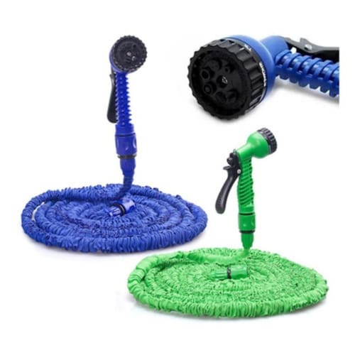 A mangueira retrátil é composta por 2 mangueiras, uma mangueira interior expansível e uma mangueira externa dobrável. O interior da mangueira é composto por látex, o que lhe confere resistência e dureza para não rachar ou apresentar rachaduras devido ao uso. A mangueira externa é feita de nylon de alta qualidade com roscas expansíveis, o que significa que ela pode se expandir 3 vezes seu tamanho. Quando a água entra no tubo da mangueira, ela começa a se expandir até 3 vezes seu tamanho autêntico e, no momento da drenagem, retorna ao tamanho autêntico. É muito leve e fácil de transportar. Não se dobra quando usada, então a água nunca para de sair. É altamente resistente. O tamanho é de 15 metros/50 pés. Você pode escolher se quer azul ou verde