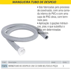 Mangueira tubo despejo para pia tanque 1m cinza beltools Apresentamos a mangueira tubo despejo 1m cz emb beltools, a escolha perfeita para suas necessidades de escoamento e drenagem, tanto em ambientes domésticos quanto comerciais. Combinando durabilidade e eficiência, esta mangueira é uma solução confiável para diversas aplicações. Benefícios e características principais: Fabricada com materiais de alta qualidade, garantindo resistência e longa vida útil. Fácil de instalar e manusear, proporcionando praticidade no dia a dia. Compatível com uma ampla variedade de equipamentos e sistemas de drenagem. Design compacto que facilita o armazenamento e transporte. Especificações técnicas: Comprimento: 1 metro Cor: cinza Diâmetro interno: 20 mm Material: pvc resistente a altas temperaturas Pressão máxima de operação: 5 bar Itens inclusos: 1 mangueira tubo despejo 1m cz emb beltools : 3 meses contra defeitos de fabricação. Ean: 7890203724741
