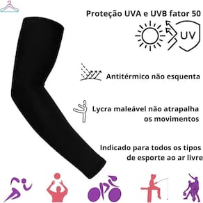 Manguito com excelente custo beneficio, para a prática de diversos esportes, inclusive o ciclismo. O Manguito é antitérmico e não esquenta, além de ter proteção solar UVA e UVB Fator 50 Possui malha maleável com lycra que não segura os movimentos do braço É muito confortável, ideal para ciclista, motociclistas, motoristas e esportes em geral
