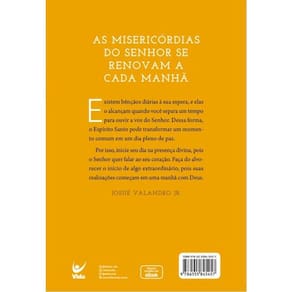AS MISERICÓRDIAS DO SENHOR SE RENOVAM A CADA MANHÃ Existem bênçãos diárias à sua espera, e elas o alcançam quando você separa um tempo para ouvir a voz do Senhor. Dessa forma, o Espírito Santo pode transformar um momento comum em um dia pleno de paz. Por isso, inicie seu dia na presença divina, pois o Senhor quer falar ao seu coração. Faça do alvorecer o início de algo extraordinário, pois suas realizações começam em uma manhã com Deus. Josué Valandro Jr