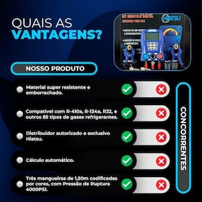 Acompanha o produto: - - 1 Manifold Digital Profissional- 2 Adaptadores Premium (HIGH E LOW)- 2 Braçadeiras de Temperatura - 8 Reparos para mangueiras refrigerantes - 3 Mangueiras codificadas por cores de 150,00cm cada- 4 Pilhas- 1 Maleta Garantia: - 3 Meses