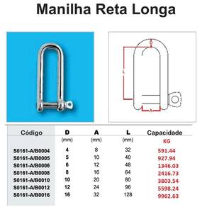 Manilha Inox Reta Longa 12Mm Com Pino Manilha reta multifuncional, utilizado para fixação de cabos, cordas e cabo de aço. Modelo utilizado para içamento de cargas, guinchos, como conector rápido. Informações adicionais: Material: inox 316 Modelo: universal Encaixe: fácil Itens inclusos: 1 manilha reta longa Marca: Não Informado