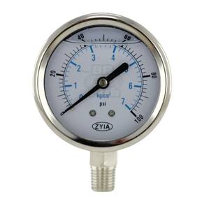 - fabricante: zyia - material: aço inox - cor: prata - conexão: 1/4 - fluido: glicerina - medições: 0 a 100 psi 0 a 7 bar - conector: lateral - diâmetro do mostrador: 2,5