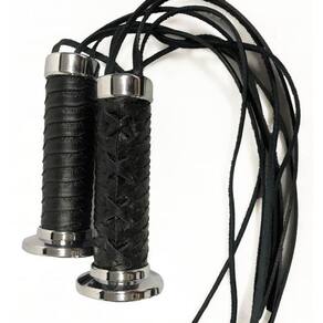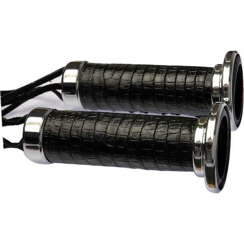 Manopla Gilimoto Modelo Ranger, revestida em couro, com ponteiras cromadas. Na medida para guidões 1 25mm de diâmetro . Cor em estoque: Preto Modelo com franjas.