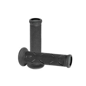 MANOPLAS PROGRIP SUPERBIKE PRETA COMPOSTO RIGIDO DURO (padrão de competição)   As manoplas Pro Grip 717 rigidas são fabricadas com material de dupla densidade, proporcionando ótima aderência (mesmo na chuva) e conforto superior.     Características principais: - Produto Italiano - Material: Borracha (COMPOSTO DURO - PARTE EXTERNA / Composto macio - parte interna) - Dimensões: 125 mm (comprimento), 30 mm (diâmetro externo) - Compatível com guidões de 22mm (diâmetro) - Manoplas vazadas para instalação dos pesos de guidão - Sulcos laterais para travamento com arame nao incluso (padrão de competição) - Vendido em pares   Itens inclusos: -01 par de manoplas    Codigo do produto: 1x PROGRIP-BLACK
