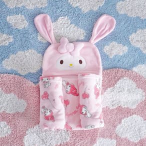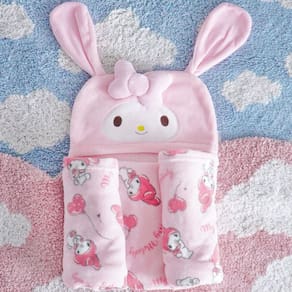 Manta com Capuz Coral Fleece Turma da Hello Kitty 75x90cm My Melody - 100%Poliéster, Tecido 220g/m², Coral Fleece, Capuz com Aplique