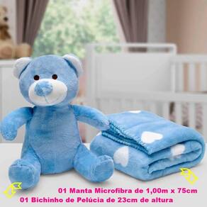 Manta E Bichinho Pelúcia Buettner Baby Microfibra Urso Azul Kit Manta com Bichinho Bouton(Microfibra super Macia), em 100% poliéster. A manta possui tamanho de 100m x 75cm e acabamento em Ponto Crochê na Bainha, envolvendo e aquecendo, proporcionando ao bebê um soninho agradável. O Kit acompanha um lindo bichinho de pelúcia, com 23cm de altura, super macio e divertido. Manta e Bichinho Pelúcia Buettner Baby Microfibra Urso Azul