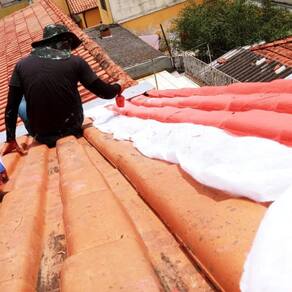 Com a manta emborrachada úmida aplicada no telhado molde e cole o bidim vp50 ou a mantatec vp50 de acordo com o formato de sua telha, sem deixar nenhuma parte solta ou enrugada.