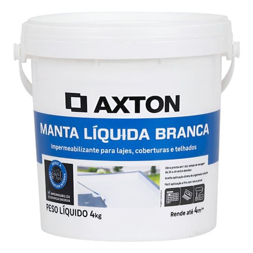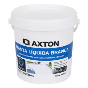 "Apresentamos a Manta Liquida Impermeabilizante Axton, na cor branca, com 4 kg de peso. Este e um produto de alto rendimento, capaz de cobrir ate 4,00 m2 por embalagem, com uma aplicacao de 1 a 1,2kg por metro quadrado. O acabamento liso proporciona uma textura agradavel e uma aparencia profissional ao seu projeto de impermeabilizacao.