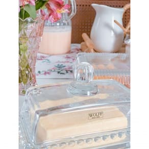 A Manteigueira Cristal G 17 cm x 10,5 cm x 10 cm Pearl Bolinha Wolff, tem beleza e sofisticação inigualáveis. Possui borda com delicadas bolinhas e transparência incrível. A linha Pearl, te permite fazer várias combinações com outras louças. Ademais, ficam lindos com roupas de mesa estampadas e coloridas. Ideal para servir no café da manhã ou café da tarde.