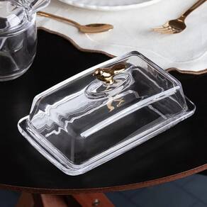 Esta peça sofisticada é inteiramente feita em cristal transparente de alta qualidade, apresentando um design clássico e lapidado que confere um brilho espetacular à mesa. O grande diferencial está na tampa, que é coroada por um delicado pássaro em relevo na cor dourada metalizada, funcionando como puxador e adicionando um charme inegável. Ideal para manter a manteiga fresca e bem apresentada, esta manteigueira é perfeita para o café da manhã ou brunch, sendo um item que une funcionalidade e um design requintado.