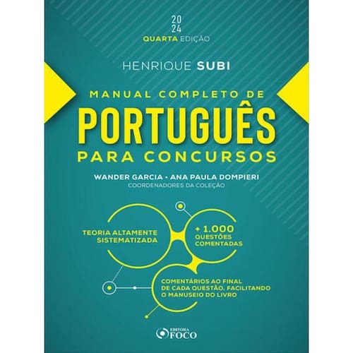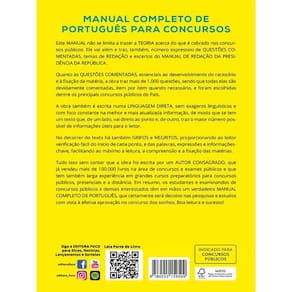 Sobre a obra Manual Completo de Português para Concursos - 4ª Ed - 2024 Este MANUAL não se limita a trazer a TEORIA acerca do que é cobrado nos concursos públicos. Ele vai além e traz, também, número expressivo de QUESTÕES COMENTADAS, temas de REDAÇÃO e excertos do MANUAL DE REDAÇÃO DA PRESIDÊNCIA DA REPÚBLICA. Quanto às QUESTÕES COMENTADAS, essenciais ao desenvolvimento do raciocínio e à fixação da matéria, a obra traz mais de 1.000 questões, sendo que todas elas são devidamente comentadas, item por item quando necessário, e foram escolhidas dentre os principais concursos públicos do País. A obra também é escrita numa LINGUAGEM DIRETA, sem exageros linguísticos e com foco constante na melhor e mais atualizada informação, de modo que se tem um texto que, de um lado, vai direto ao ponto e, de outro, traz o maior número possível de informações úteis para o leitor. No decorrer do texto há também GRIFOS, NEGRITOS e uso de CORES DIFERENCIADAS, proporcionando ao leitor verificação fácil do início de cada ponto, e das palavras, expressões e informações-chave, facilitando ao máximo a leitura, a compreensão e a fixação das matérias. Tudo isso sem contar que a obra foi escrita por um AUTOR CONSAGRADO, que já vendeu mais de 100.000 livros na área de concursos e exames públicos e que tem também larga experiência em grandes cursos preparatórios para concursos públicos, presenciais e a distância. Em resumo, os estudantes e examinandos de concursos públicos e demais interessados têm em mãos um verdadeiro MANUAL COMPLETO DE PORTUGUÊS, que certamente será decisivo nas pesquisas e estudos com vista à efetiva aprovação no concurso dos sonhos. Boa leitura e sucesso!