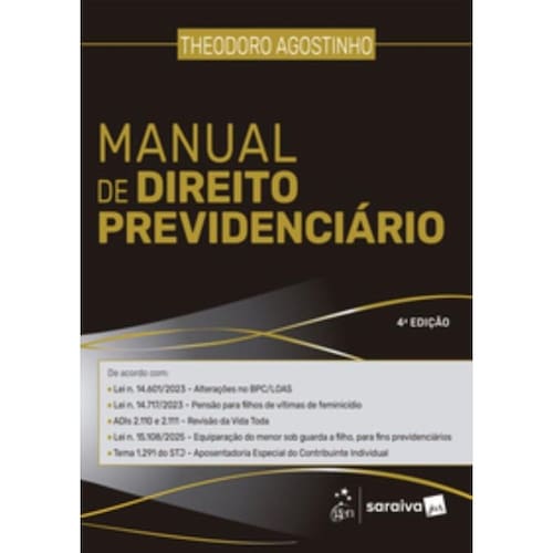 Manual de Direito Previdenciário tem o objetivo de sistematizar toda a matéria dessa disciplina, apresentando diversos diferenciais: orientações em destaque (PREVDICAS); temas pouco abordados em outros cursos, como o processo previdenciário (incluindo processo administrativo fiscal e ações previdenciárias); e poucas notas de rodapé, que tiram a atenção e o foco do texto. Theodoro Agostinho utiliza toda a sua experiência como professor de direito previdenciário para trazer conteúdo seguro, amplo e didático, visando o melhor aprendizado possível ao leitor. Vale ressaltar que o livro está atualizado com a Reforma da Previdência Emenda Constitucional n. 103/2019 , com o Decreto n. 10.410/2020, assim como com a Instrução Normativa do INSS n. 128/2022, a Lei n. 14.601/2023 alterações no BPC/LOAS e a Lei n. 14.717/2023 pensão para filhos de vítimas de feminicídio e com as legislações e portarias editadas nos anos de 2024 e 2025. O autor e o selo Saraiva Jur estão certos de que esta obra será extremamente útil aos estudantes que cursam a disciplina de Direito Previdenciário, bem como aos candidatos que se preparam para os mais diversos concursos públicos que exigem conhecimento da matéria.