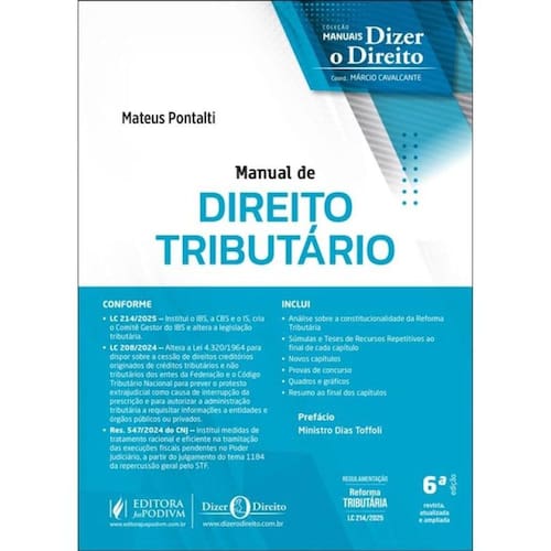 Conforme a REGULAMENTAÇÃO DA REFORMA TRIBUTÁRIA Prefácio - Ministro Dias Toffoli CONFORME: • LC 214/2025 — Institui o IBS, a CBS e o IS, cria o Comitê Gestor do IBS e altera a legislação tributária. • LC 208/2024 — Altera a Lei 4.320/1964 para dispor sobre a cessão de direitos creditórios originados de créditos tributários e não tributários dos entes da Federação e o Código Tributário Nacional para prever o protesto extrajudicial como causa de interrupção da prescrição e para autorizar a administração tributária a requisitar informações a entidades e órgãos públicos ou privados. • Res. 547/2024 do CNJ — Institui medidas de tratamento racional e eficiente na tramitação das execuções fiscais pendentes no Poder Judiciário, a partir do julgamento do tema 1184 da repercussão geral pelo STF. INCLUI: • Análise sobre a constitucionalidade da Reforma Tributária • Súmulas e Teses de Recursos Repetitivos ao final de cada capítulo • Novos capítulos CONTÉM: • Provas de concurso • Quadros e gráficos • Resumo ao final dos capítulos POR QUE ESCOLHER O LIVRO “MANUAL DE DIREITO TRIBUTÁRIO”? O fenômeno da tributação (o qual pode perpassar por processo administrativo contencioso ou não contencioso e/ou ação judicial, bem como ser direcionado a pequenos e microempreendedores) é tratado de modo integral na obra, desde a instituição do tributo até sua arrecadação, com espaço, ainda, para aspectos de Direito Financeiro relevantes e conexos com diversos tributos. Outro ponto de destaque é a atualidade da obra. Além disso, vale mencionar que o autor, ao longo de todo o livro, dialoga com outros importantes tributaristas e com doutrinadores de renome de outros ramos do Direito. Os esquemas, as tabelas, os gráficos, os exemplos e as diversas listas de exercícios com questões gabaritadas de concursos públicos presentes no manual muito auxiliam na absorção das lições, na preparação para variados certames públicos e na aplicação prática das matérias. Em relação à pessoa do autor, cumpre-me reiterar as qualidades já acentuadas em prefácio pelo Juiz Federal Márcio André Lopes Cavalcante. A vocação dele para o magistério fica explícita com a leitura deste livro. O autor, profundo conhecedor do Direito Tributário e das complexas matérias desse ramo, traduz seu conhecimento em lições de fácil entendimento, sem se desgarrar em nenhum momento da boa técnica. Dias Toffoli - Ministro do STF Marca: Não Informado