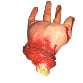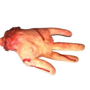 Especificações técnicas do produto: Mão de borracha realística assustador- membro decepado efeito de borracha e látex, não prejudicial a saúde. Utilizado em festas, brincadeiras, eventos, cinema, teatro tv e muito mais. Atenção vendido 1 peça Mão sem um dos dedos.
