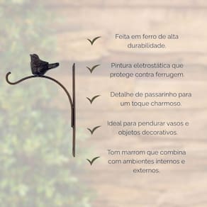 Fabricado em ferro resistente com pintura marrom, combina durabilidade e charme, valorizando qualquer ambiente onde for instalado.