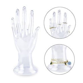 Características Principais: - Feita de plástico acrílico injetado; - Leve e durável; - Transparência que realça as joias sem interferir na sua aparência; - Visual sofisticado e minimalista; - Design anatômico, permitindo uma exposição natural e elegante das peças; - Base firme que evita tombamentos durante a exposição; - Ideal para vitrines de joalherias, lojas de bijuterias ou mesmo organização pessoal.
