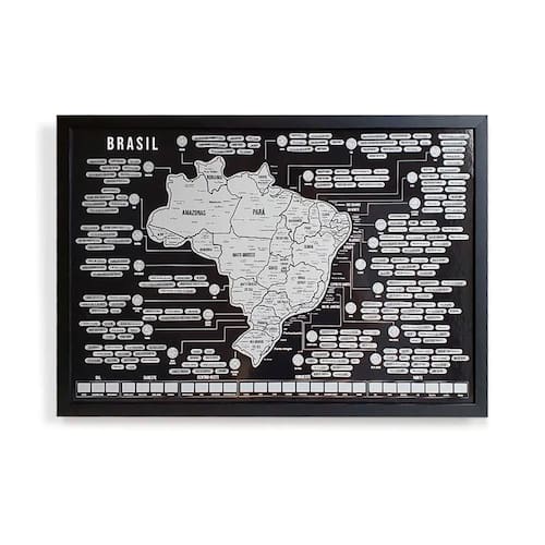 Mapa Do Brasil Raspadinha Grande Com Moldura Preta 73X50 Já vai com moldura, pronto para pendurar :) Como funciona Esse mapa é perfeito para pessoas que adoram viajar. Conforme você viaja, vai raspando os lugares que visitou e o mapa vai ficando colorido :) 200 principais lugares / praias do país. Não é possível colocarmos todos os pontos turísticos do Brasil devido ao espaço físico do mapa . Por isso, muito provavelmente alguns pontos você não encontrará. Então raspe o estado que visitou :) Características: Fabricação própria, produto exclusivo, 100% feito no brasil. Após raspado, os países ficam coloridos. Todos os nomes em português. Tamanho total: 73x50cm. Já vai emoldurado. Mapa é colado no fundo, evitando de sair ou enrugar. Moldura de qualidade, 100% lisa, livre de imperfeições. Acompanha pendurador.
