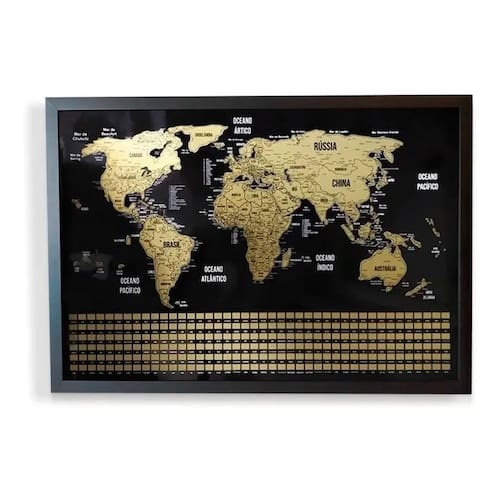 Mapa Mundi De Raspar Raspadinha Bandeiras 73X50 Com Moldura Mapa Mundi De Raspar Com Bandeiras. Como funciona Esse mapa é perfeito para pessoas que adoram viajar. Conforme você viaja, vai raspando os países que visitou e o mapa vai ficando colorido : Características Fabricação própria, produto exclusivo, 100% feito no brasil. Após raspado, os países ficam coloridos. Todos os nomes em português. Tamanho total: 73x50cm. Já vai emoldurado. Mapa é colado no fundo, evitando de sair ou enrugar. Moldura de qualidade, 100% lisa, livre de imperfeições. Acompanha pendurador.