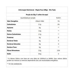Maple Free (280g) - Padrão: único Maple Free (280g) Maple Free da Mrs Taste é uma calda de isomalto-oligossacarídeos sabor Maple, 100% natural, sem conservantes, VEGANO, GMO-Free e é adoçado com Stevia. E ainda é RICO em fibras, sua porção de 20g possui 8g de fibras! Feito com Maltitol e Xarope de isomalto-oligossacarídeos, além de ser zero açúcares, possui inúmeros benefícios trazidos por seus ingredientes. Com um índice glicêmico de apenas 35, ele não influencia em aumentos de insulina e açúcar no sangue, sendo assim um ótimo produto a ser consumido por diabéticos. Ainda tem mais, não causa cáries e auxilia na absorção de minerais. Benefícios: - Sabor Maple;- 100% natural;- Sem conservantes;- Vegano;- Livre de organismos geneticamente modificados;- Adoçado com Stevia;- Rico em fibras, sua porção de 20g possui 8g de fibras. Informação Nutricional Maple Free (280g) - Mrs TastePorção de 20g (1 colher de sopa)Quantidade por porção%VD(*)Valor Energético25kcal=104kJ1%Carboidratos5,1g2%Açúcares0g**Polióis3,0g**Outros Carboidratos2,1g**Proteínas0g0Gorduras Totais0g0Gorduras Saturadas0g0Gordura Trans0g**Fibras Alimentares5,5g22%Sódio0mg0* % Valores Diários com base em uma dieta de 2.000Kcal ou 8400kJ. Seus valores diários podem ser maiores ou menores dependendo das suas necessidades energéticas.** VD não estabelecido. Marca: Não Informado