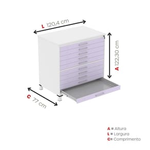 Possui 10 gavetas amplas com corrediças que facilitam a abertura, mesmo com carga total.