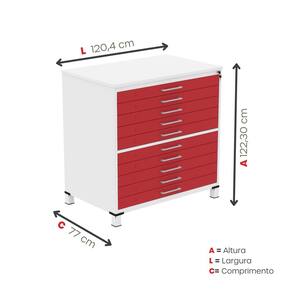 Possui 10 gavetas amplas com corrediças que facilitam a abertura, mesmo com carga total.