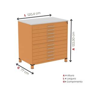 Possui 10 gavetas amplas com corrediças que facilitam a abertura, mesmo com carga total.