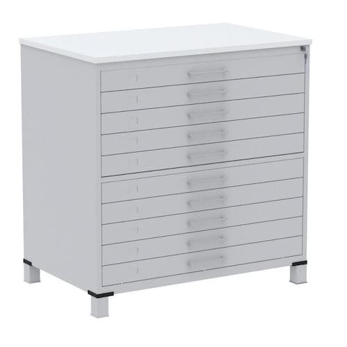 Mapoteca 10 Gavetas Pandin 120 cm (Larg) Inmetro Tampo MDP Branco Estrutura Aço Cinza Gavetas Cinza