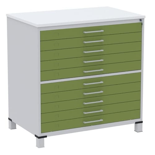 Fabricada com chapa de aço resistente, a mapoteca de aço galvanizado foi desenvolvida com um processo de tratamento anticorrosivo de nanotecnologia e pintada com tinta híbrida eletrostática para maior durabilidade. Com chapas mistas de aço #22 (0,75mm), #24 (0,60mm) e tampo em MDP de 25mm, garante robustez e eficiência perfeitas para espaços de trabalho que necessitam de armazenamento especializado.